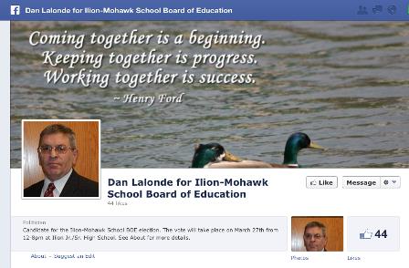 Dan LaLonde Running for New School BoardDan LaLonde was first elected to serve on the Ilion Board of Education in 1999. He currently serves as the Board of Education President at Ilion. In addition, he is currently serving as Vice President of the Herkimer County BOCES Board. Dan retired from the Ilion Fire Department in 1992 after a career ending injury. He has been married for almost 25 years and has three children. He is active within the community having coached soccer and youth basketball for over 16 years. College: Herkimer County College '77 Accounting, High School: Ilion Junior - Senior High School '75 contact email (March 13, 2013)