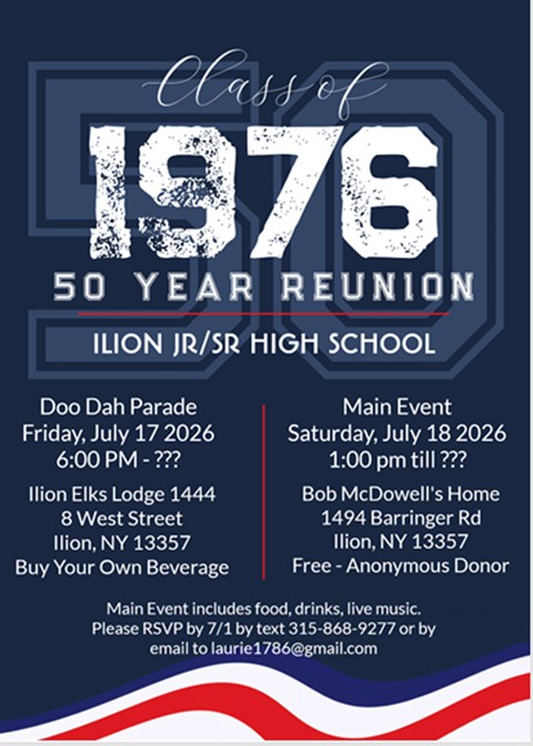 1976 - 50th Reunion CelebrationJoin us for our 50th class reunion - July 17, 2026 - July 18, 2026. See Facebook event. Friday is the Doo Dah parade at Elks Club and Saturday is main event at Bob McDowel's house at 1494 Barringer Road by The Flower Barn. Main event includes food, drinks, live music. RSVP by July 1 by text to 315-868-9277 or email laurie786@gmail.com. (February 26, 2026)